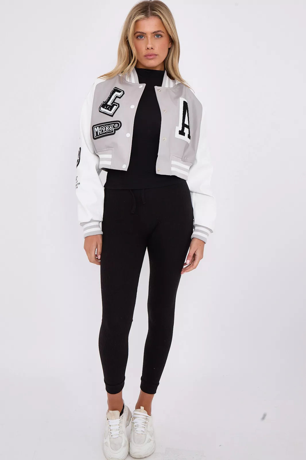 Elevate your wardrobe effortlessly with our Faux Leather Varsity Bomber Jacket. This chic, cropped jacket blends classic varsity style with modern flair, featuring bold letter details, contrasting sleeves, and button fastening. Crafted from high-quality faux leather and available in beige, black, and silver grey, it's perfect for any outfit. Available in sizes XS-2XL, this versatile jacket is your go-to for a sporty yet edgy look.